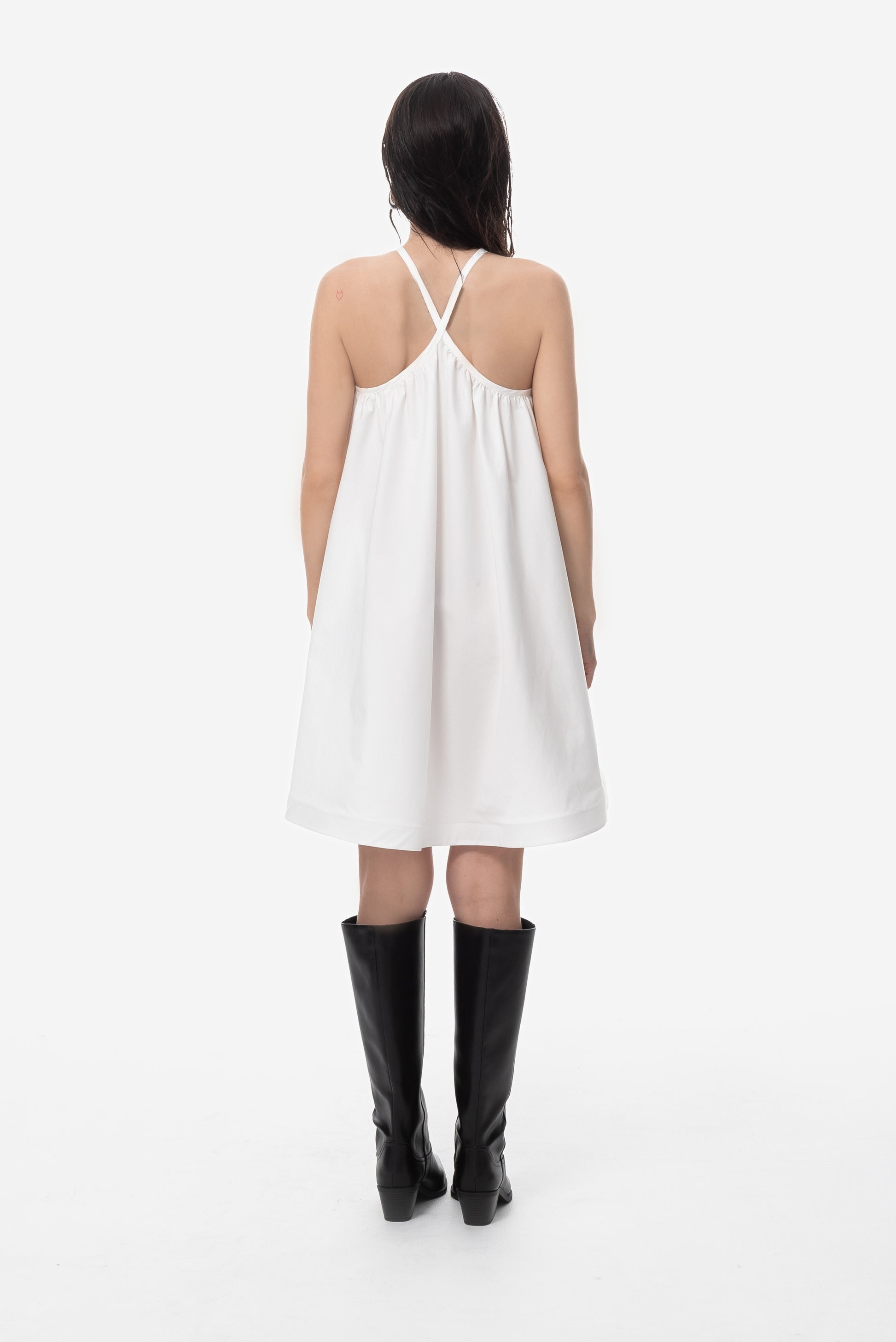 Минималистична разкроена рокля, изработена от висококачествен италиански плат.