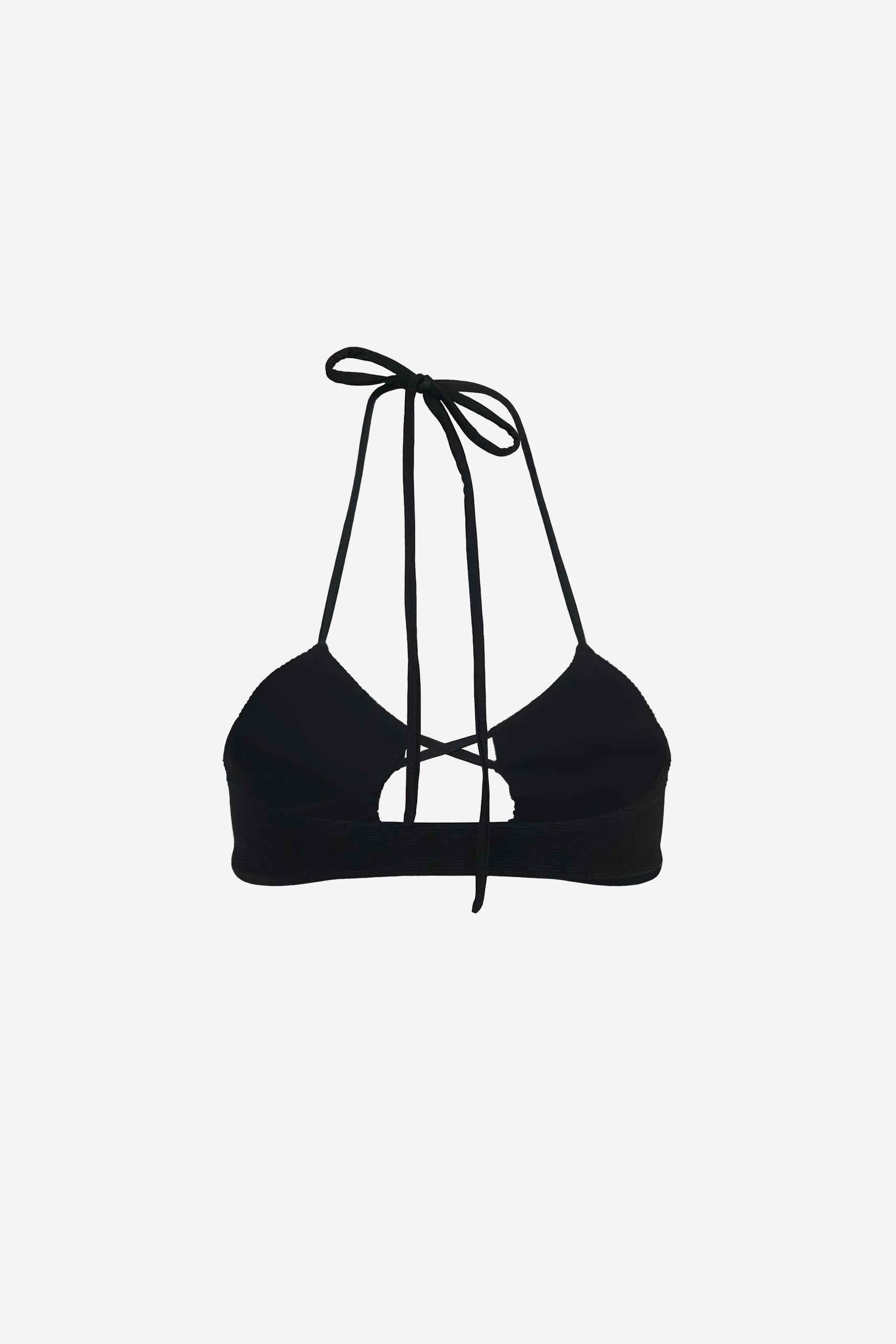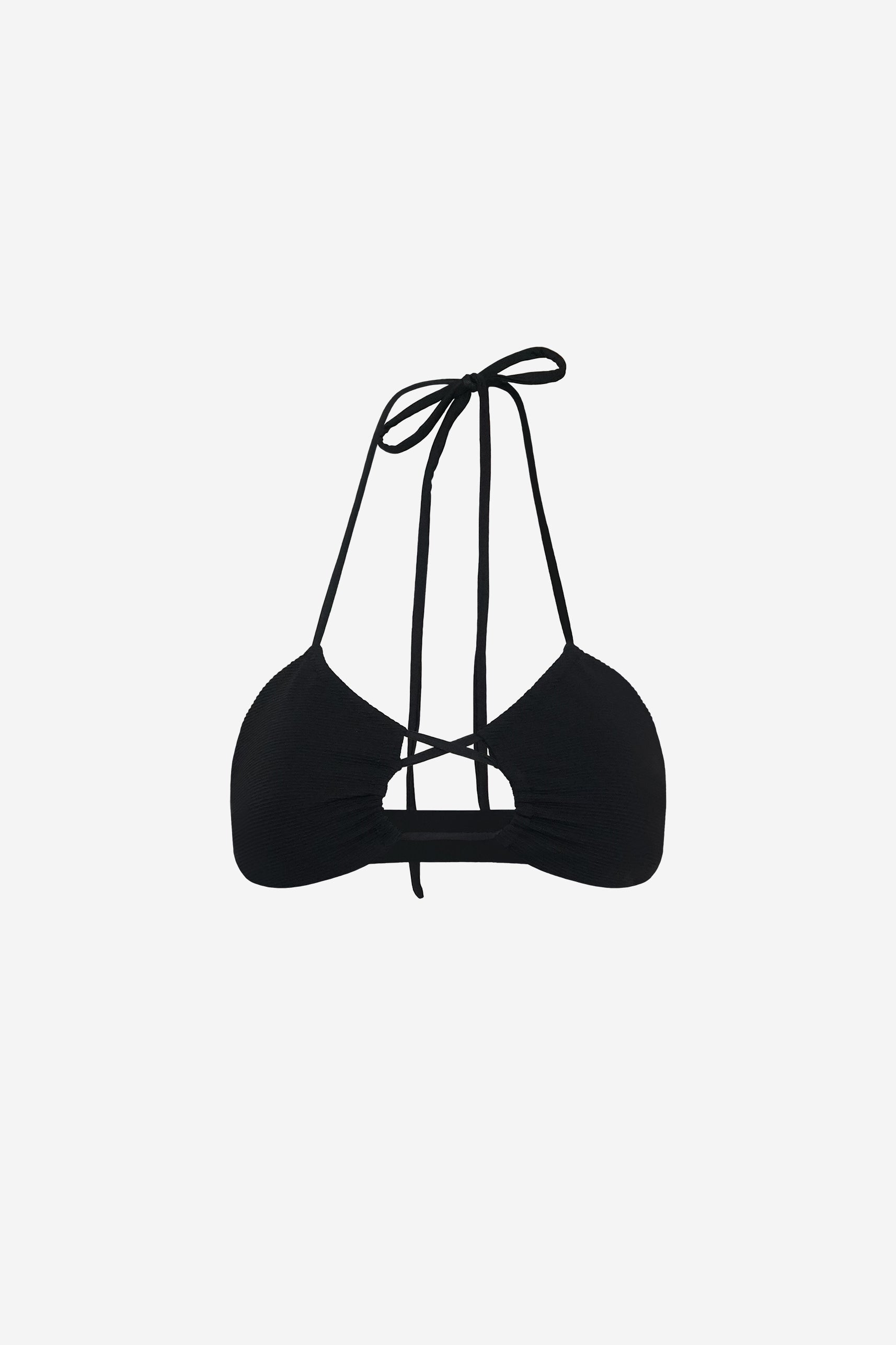 Горната част на бански BLACK RILA в размери S,M и L. Моделът е изработен от висококачествена структурна материя, тип рибс, а вътрешната част е изработена от мек хастар. Тънките презрамки зад врата позволяват да се регулира според предпочитанията ви.