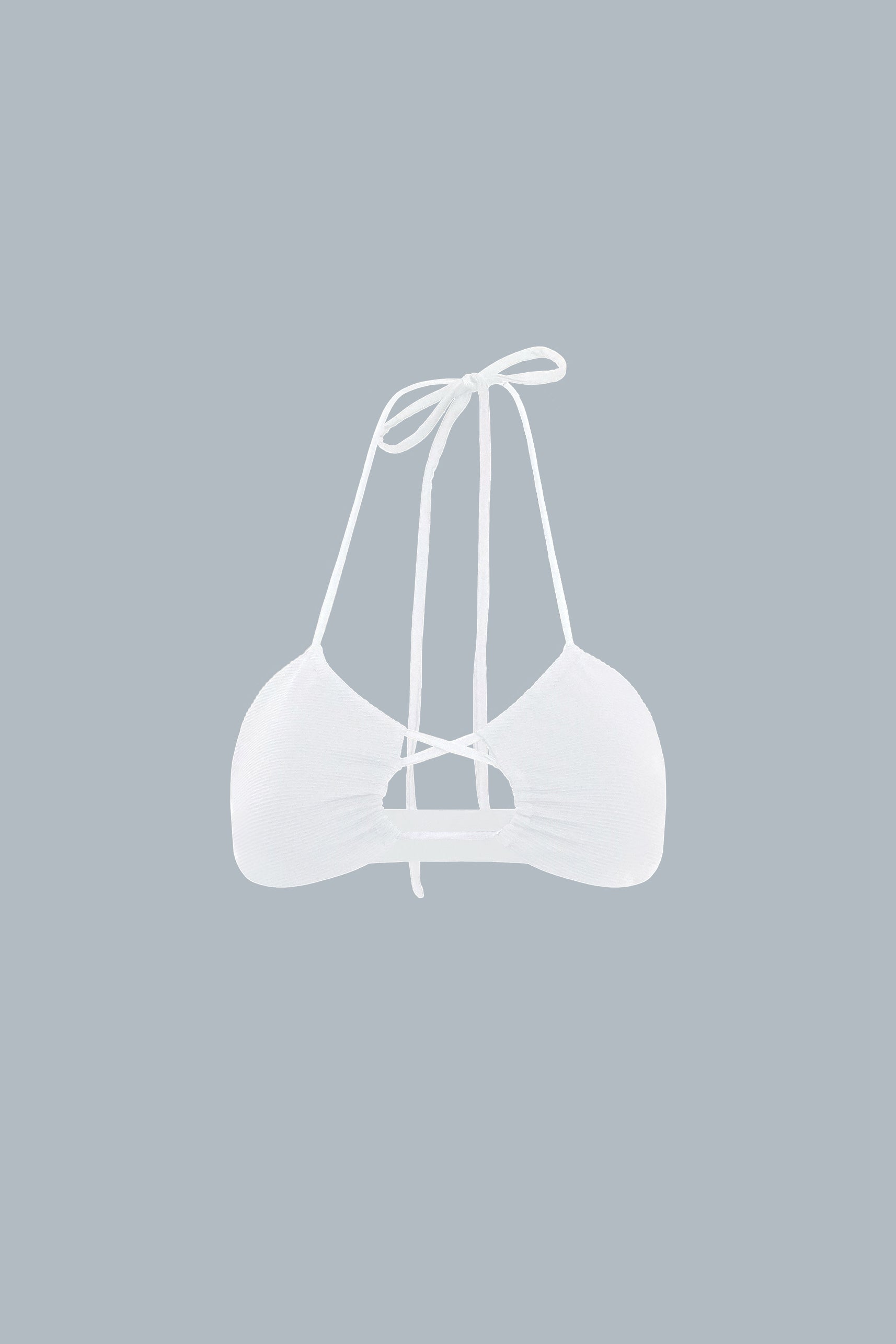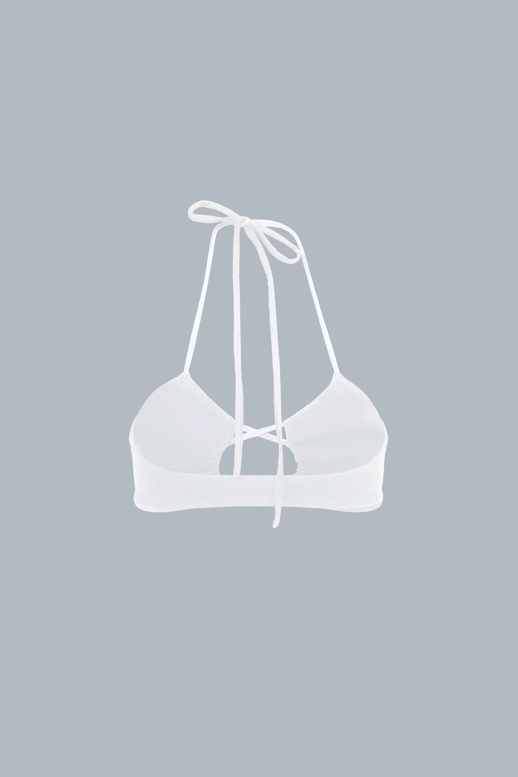 Горната част на бански WHITE RILA в размери S,M и L. Моделът е изработен от висококачествена структурна материя, тип рибс, а вътрешната част е изработена от мек хастар. Тънките презрамки зад врата позволяват да се регулира според предпочитанията ви.
